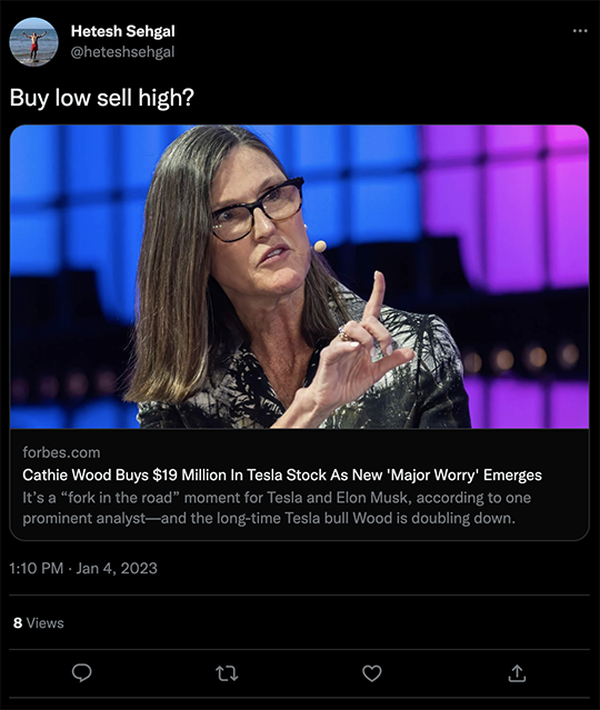 We have nothing to add, other than what an anonymous submitter pointed out at the Fark website: “Cathie Wood’s ETF lost 67% last year, so maybe Tesla only losing 65% makes it look like a winner to her.”